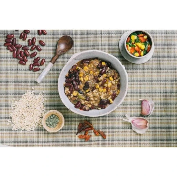 Lækker chili con carne ret serveret med fuldkornsris. Nem og hurtig at tilberede ude i naturen. Tilsæt blot koldt vand, og den medfølgende varmepose sørger for at tilberede din mad, så du hverken behøver potter, pander eller åben ild. Det er en nem og praktisk løsning til outdoorentusiasten, så du let kan spise en dejlig, varm ret under åben himmel.