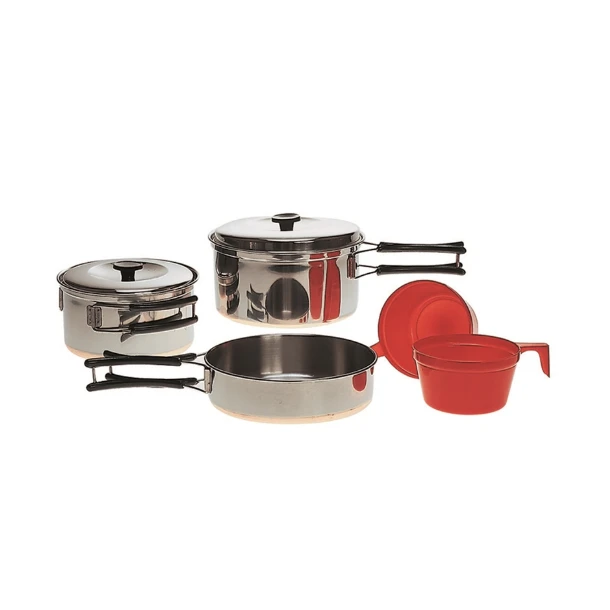 Dette grydesæt fra Mil-Tec er fremstillet i rustfrit stål og består af en pande, to gryder med låg samt to kopper i plastik. Sættet vejer blot 670 gram. Stofpose til opbevaring medfølger.