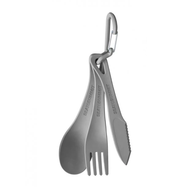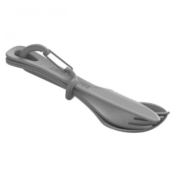 3-delt bestiksæt fremstillet i fødevaregodkendt BPA-fri polypropylen. Kort skaft, som kan pakkes ned i ex. Trangiasæt eller Light My Fire MealKit. Leveres med praktisk karabin, som holder sammen på de tre dele.