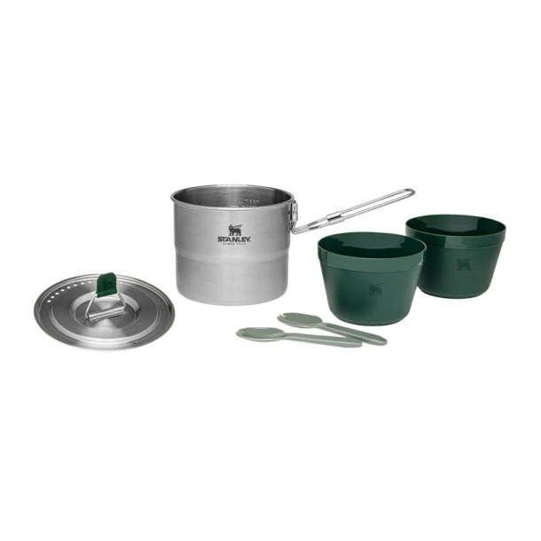Stanley – Stainless Steel Kogesæt For To er et ideel til udendørs madlavning, da den indeholder to sporks, en gryde (1 liter) og to skåle (354 ml), som alt sammen kan pakkes ned i gryden, så du nemt kan transportere dit kogesæt. Skålene e lavet af BPA-fri plastik og gryden er lavet af 18/8 rustfri stål. Derudpover er gryden udstyret med et låsbart håndtag, der kan klappes sammen hvis det bliver nødvendigt, og en måleskala på ydresiden af skålen.