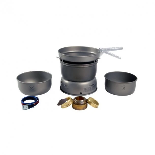 Dette Tragia sæt er fremstillet i meget robust og hårdt anodiseret aluminium hvilket gør det op til 50 % stærkere end alm. aluminium. Dette sæt som kan lave mad til 3-4 personer på én gang består af 2 vindskærme, 2 gryder på 1,5 og 1,75 liter, 1 låg/pande 22 cm. Derudover medfølger spritbrænder B25, greb og rem.