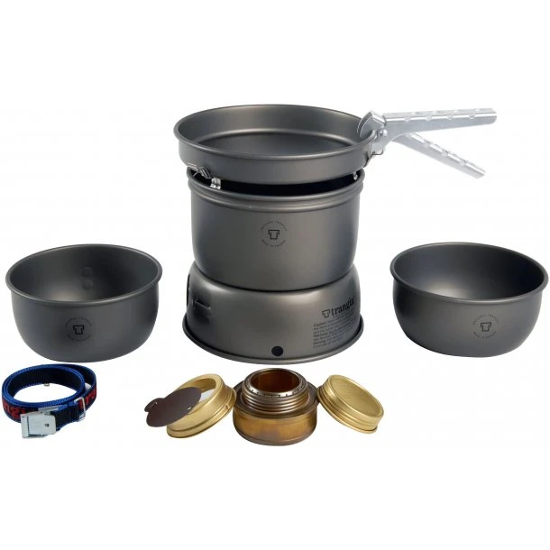 Stormkøkken 27-1 Hård Anodiseret fra svenske Trangia fremstillet i hårdt anodiseret aluminium, der er op til 50 % stærkere end almindelig aluminium. Består af 2 stk. vindskærme, 2 stk. kasseroller på 1 liter, 1 stk. grydelåg som også fungerer som pande samt spritbrænder B25, greb og rem.