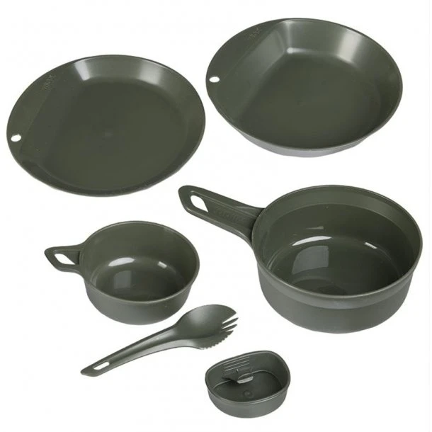 - Sættet består af tallerken, dyb tallerken, står skål, lille skål, spork og fold-ud kop.